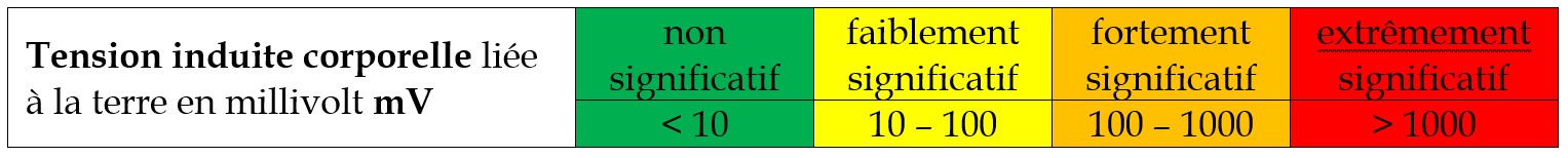 Ce courant se mesure entre le corps et le potentiel de terre (0 V) via un appareil dit de mesure de tension induite. Cette tension est alternative (AC) et non continue (DC).