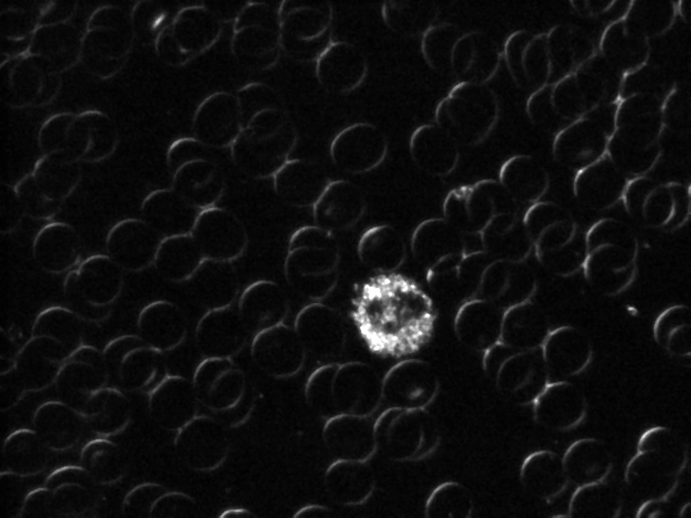 Globules rouges en mauvais état observés au microscope à fond noir.