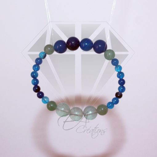 Ce bracelet est composé de 27 pierres d’agate bleue, de fluorite et de jade.