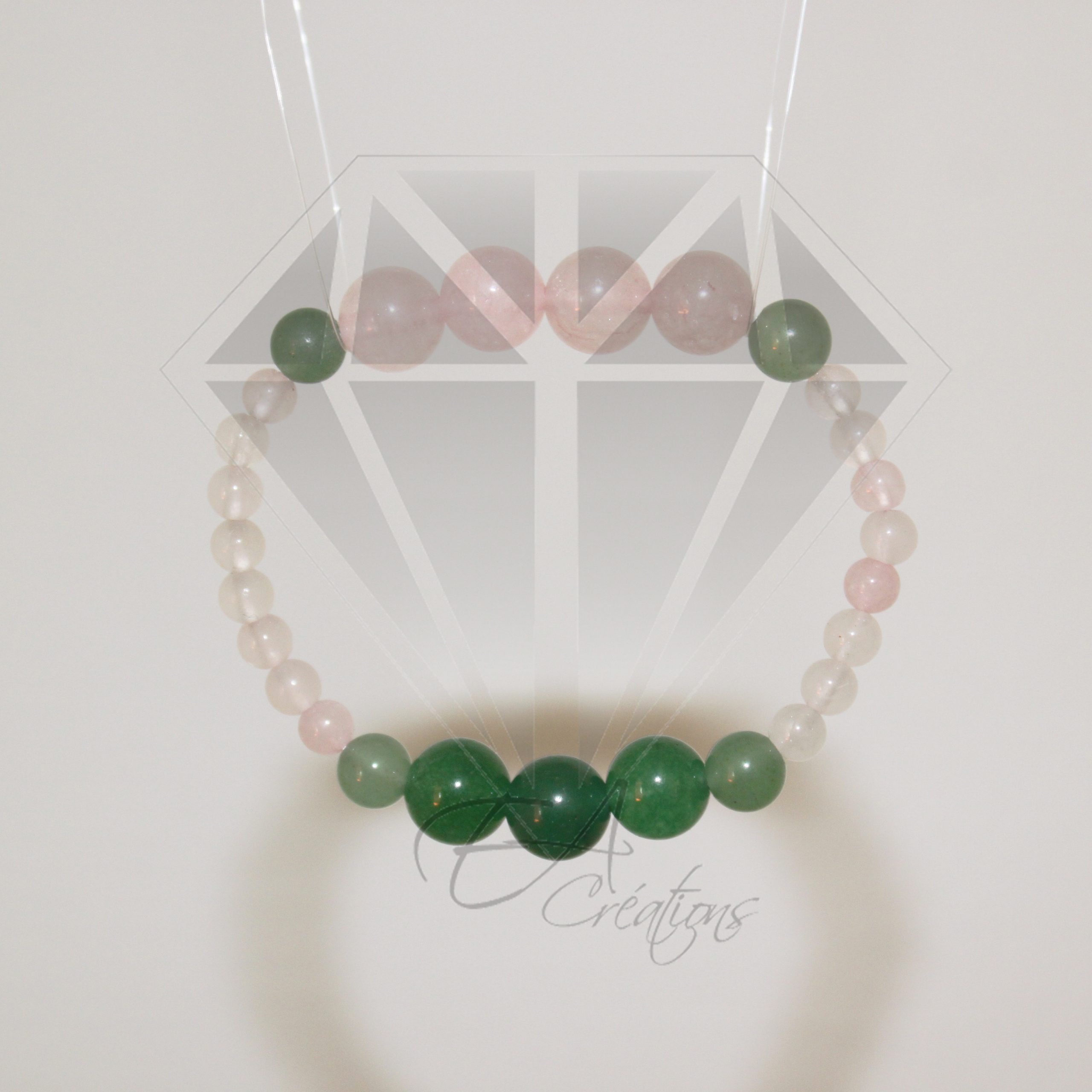 Ce bracelet est composé de 27 pierres de jade et de quartz rose allant de 4 mm à 8 mm.