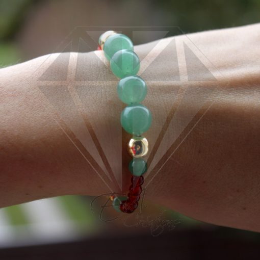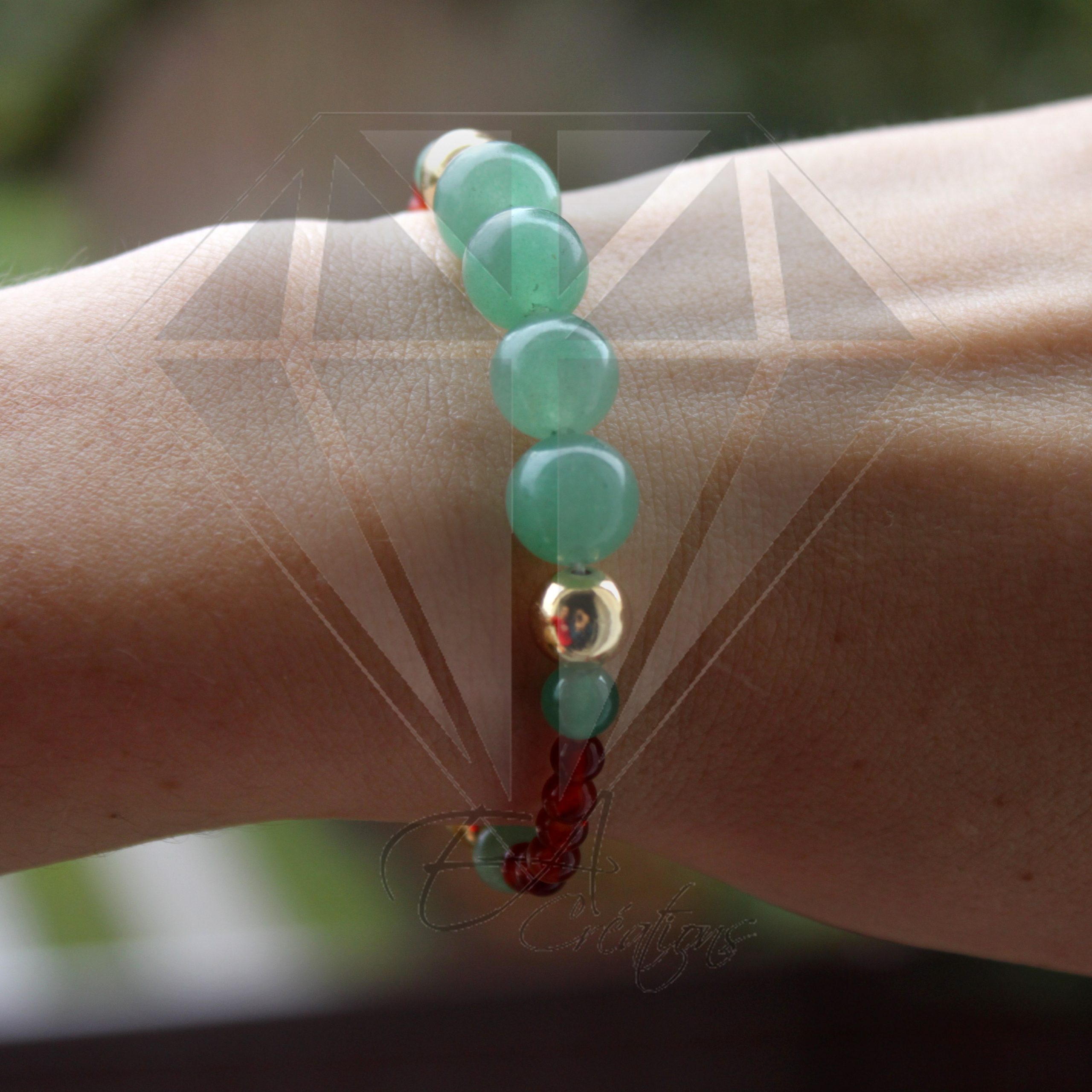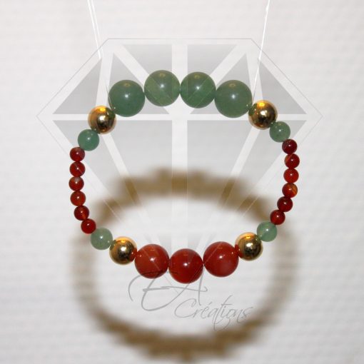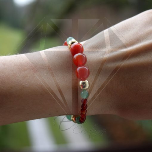 Ce bracelet est composé de 27 pierres de cornaline, de jade et d’argent plaqué or 24 carats allant de 4 mm à 10 mm.