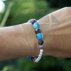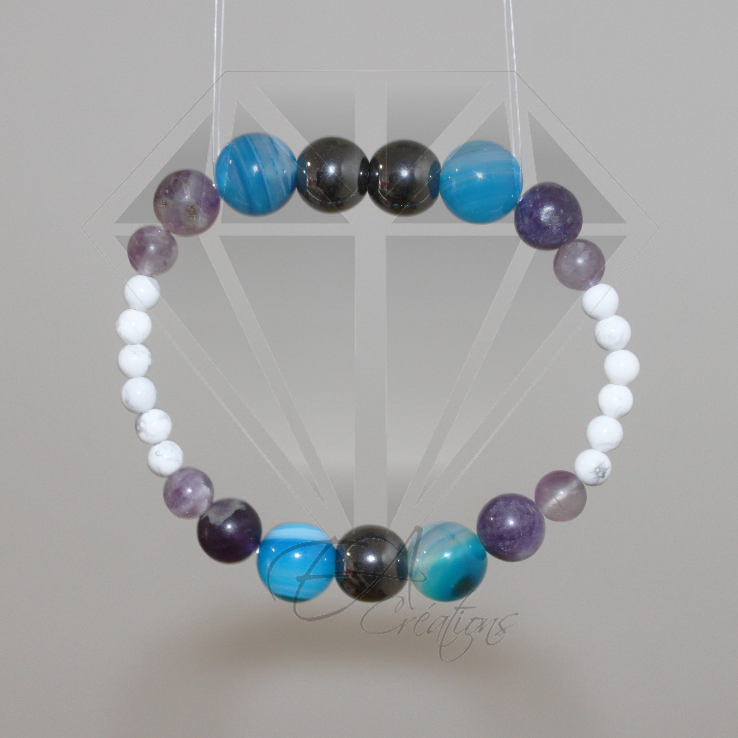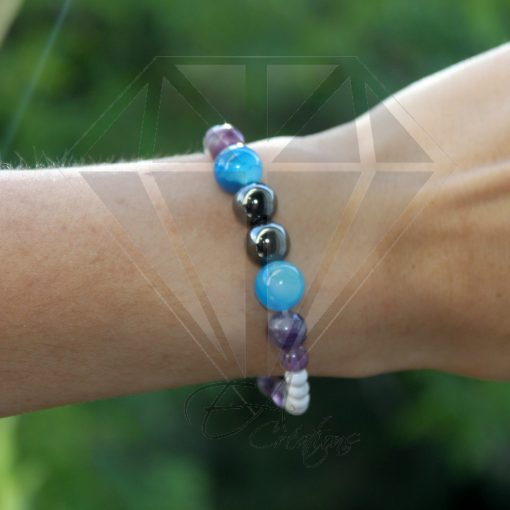 Ce bracelet est composé de 27 pierres d’agate bleue, de fluorite, de howlite et d’hématite de 4 mm à 10 mm.