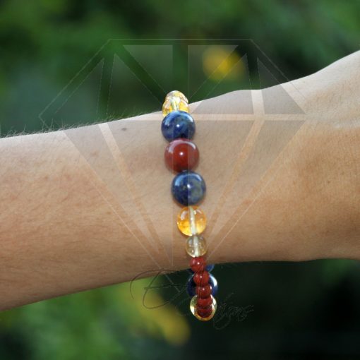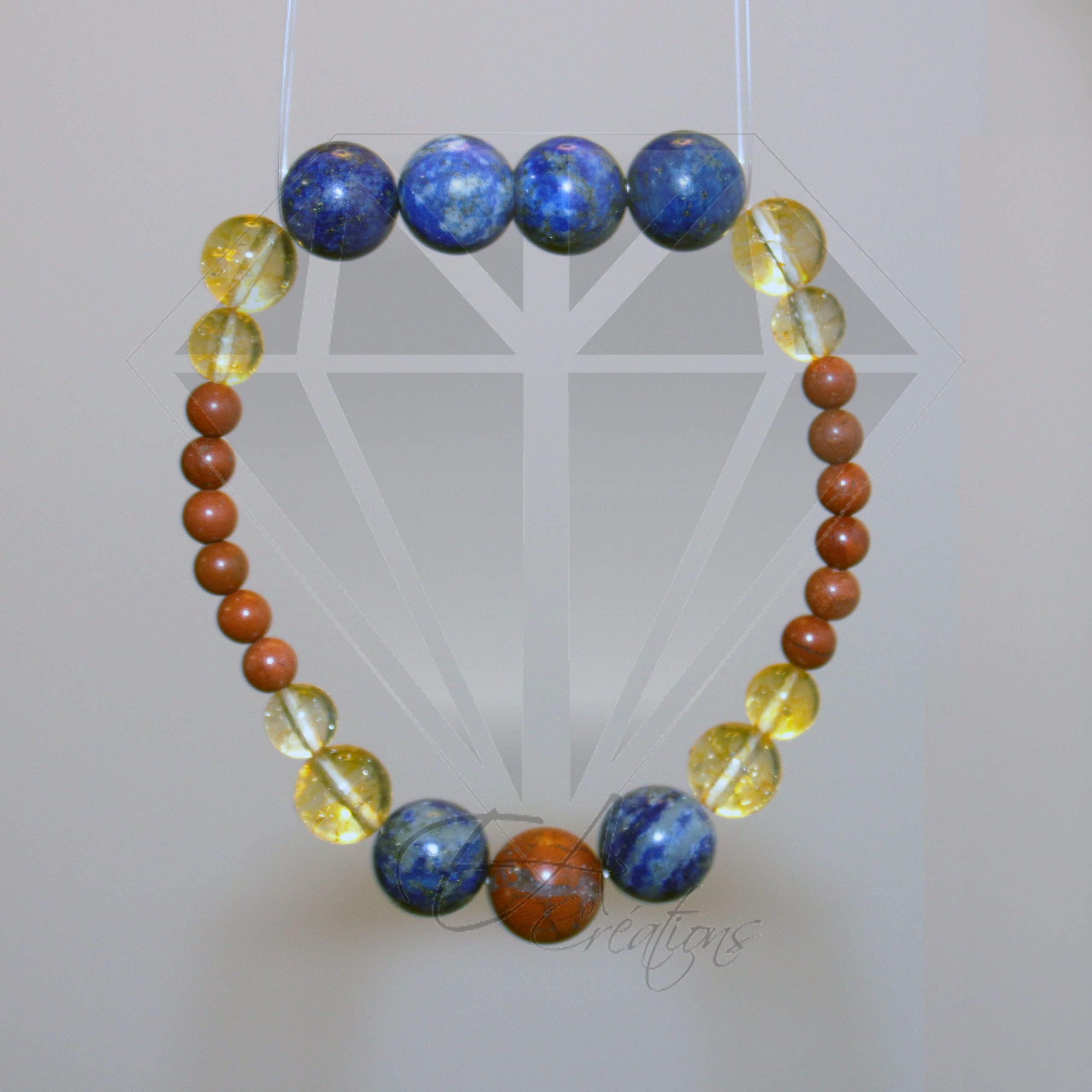 Ce bracelet est composé de 27 pierres de citrine, jaspe rouge et lapis lazuli allant de 4,5 mm à 10 mm.