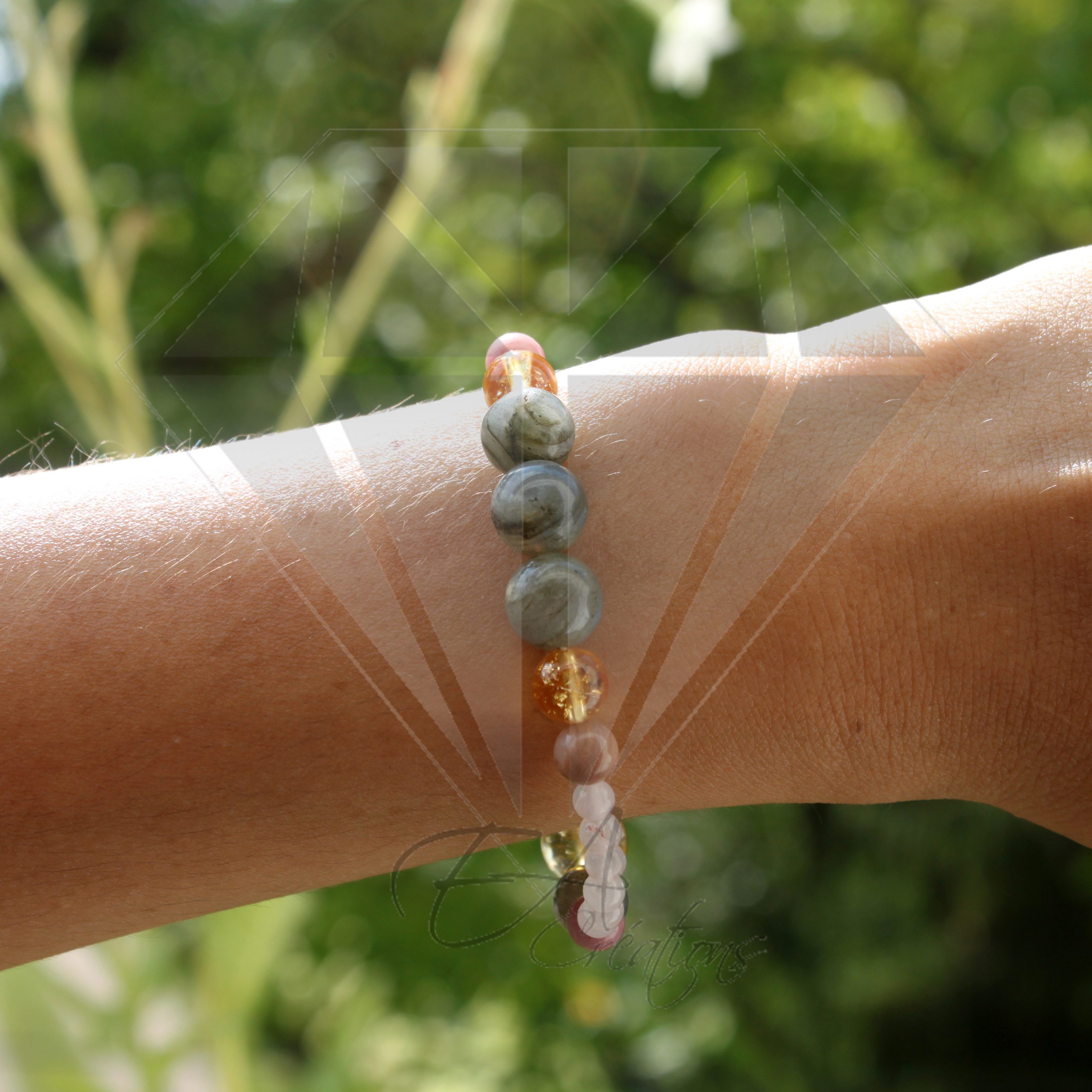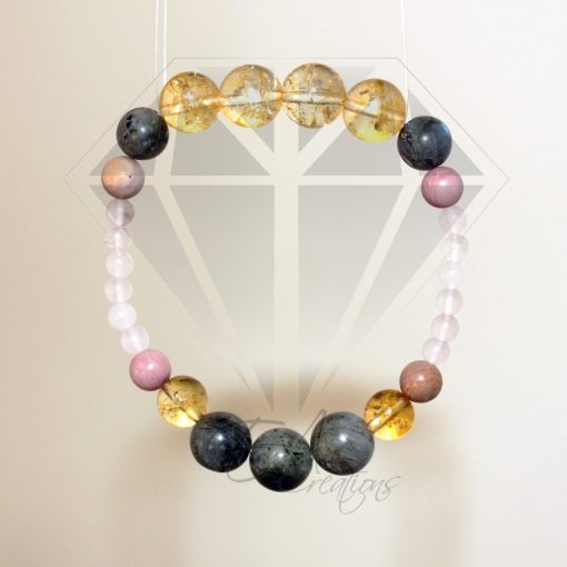 Ce bracelet est composé de 27 pierres de citrine, labradorite, quartz rose et rhodochrosite de 4 mm à 10 mm.