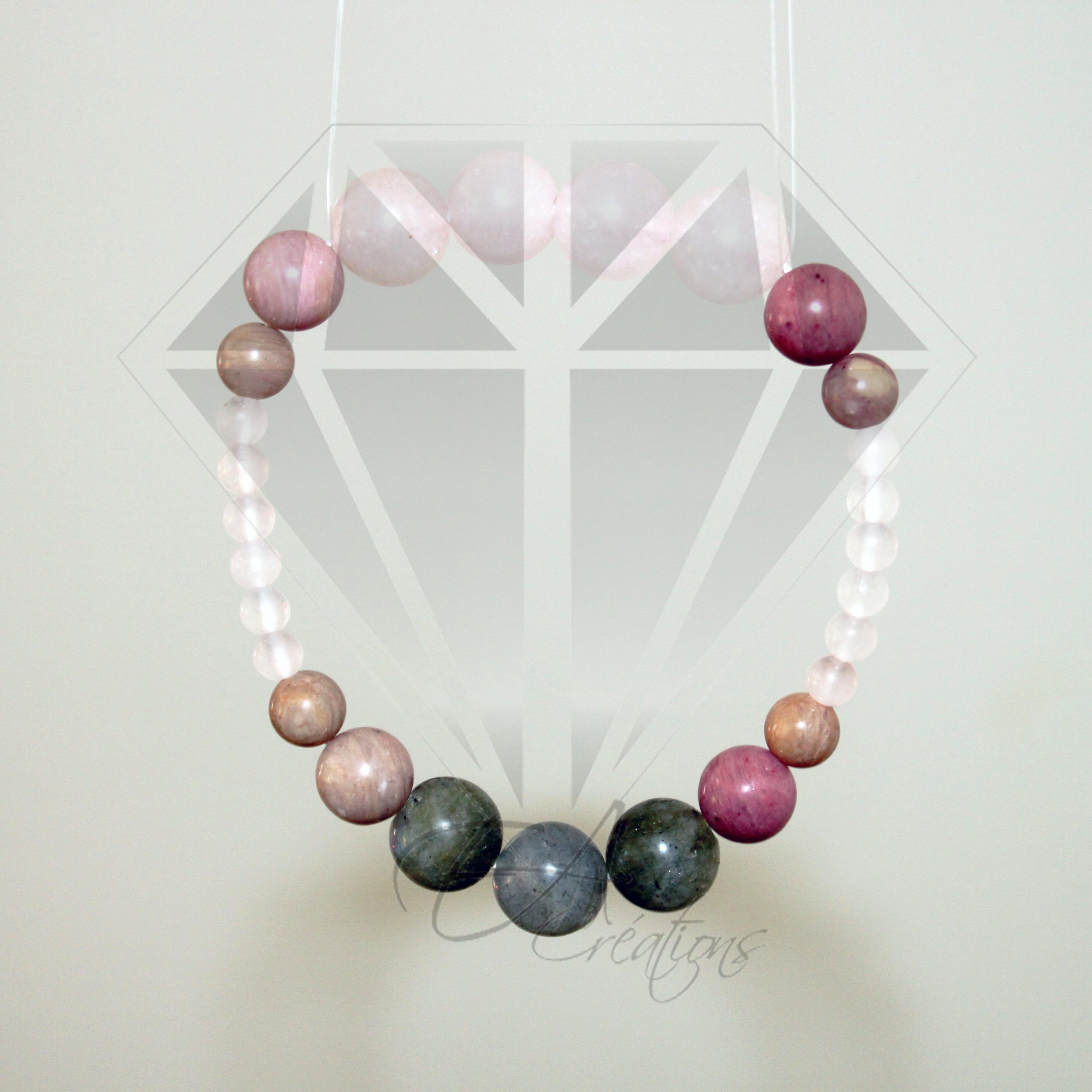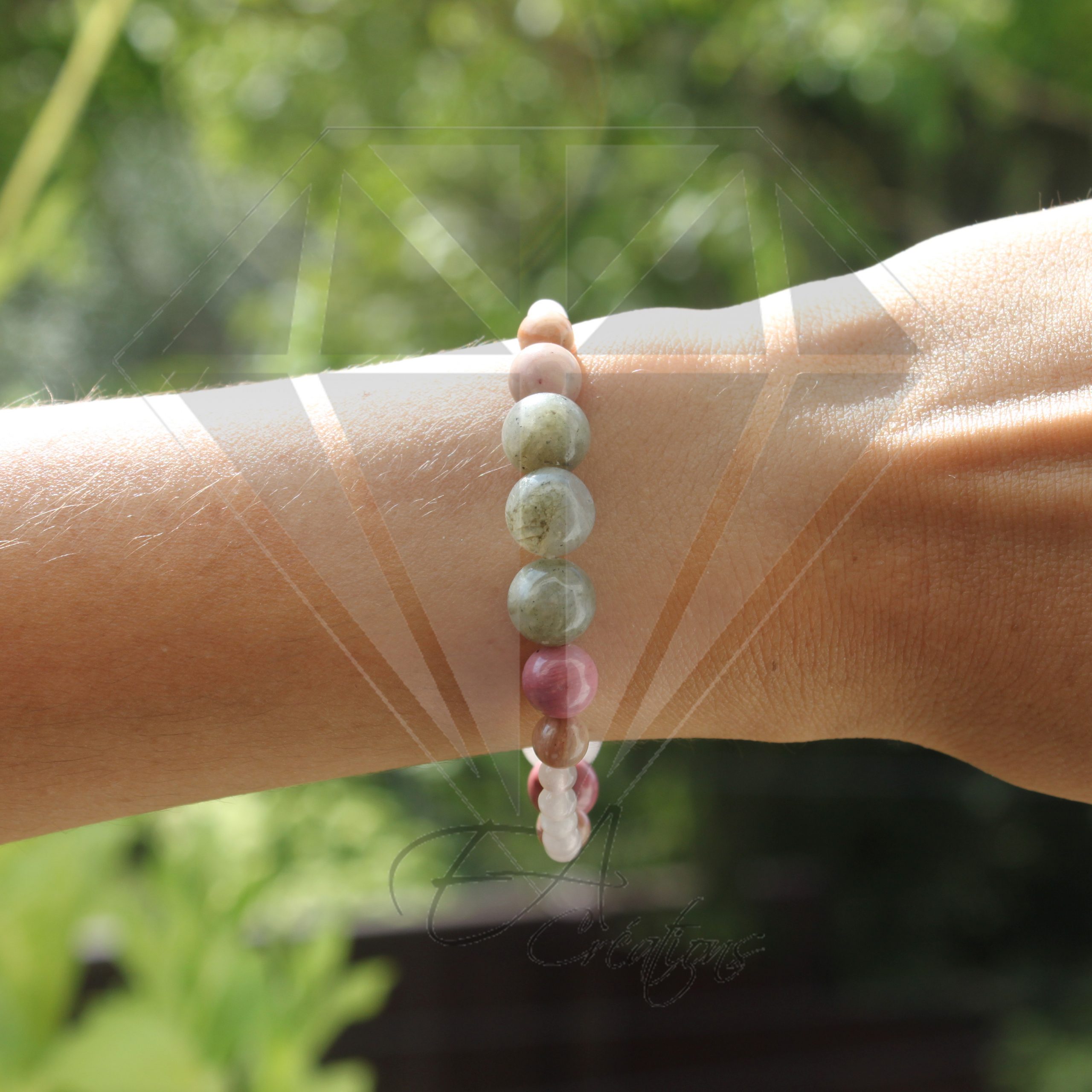 Ce bracelet est composé de labradorite, de quartz rose et de rhodochrosite de 4 mm à 6 mm.