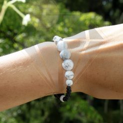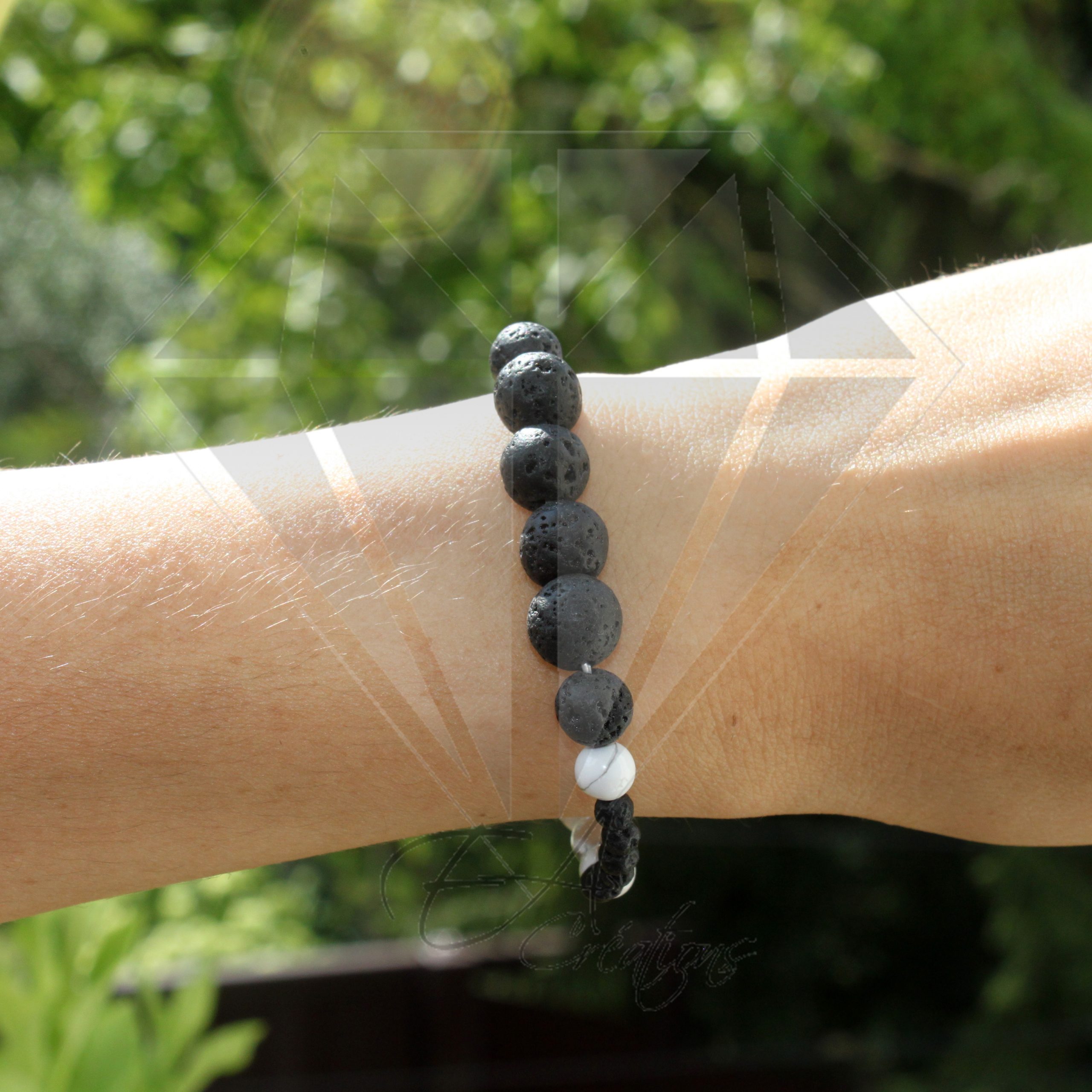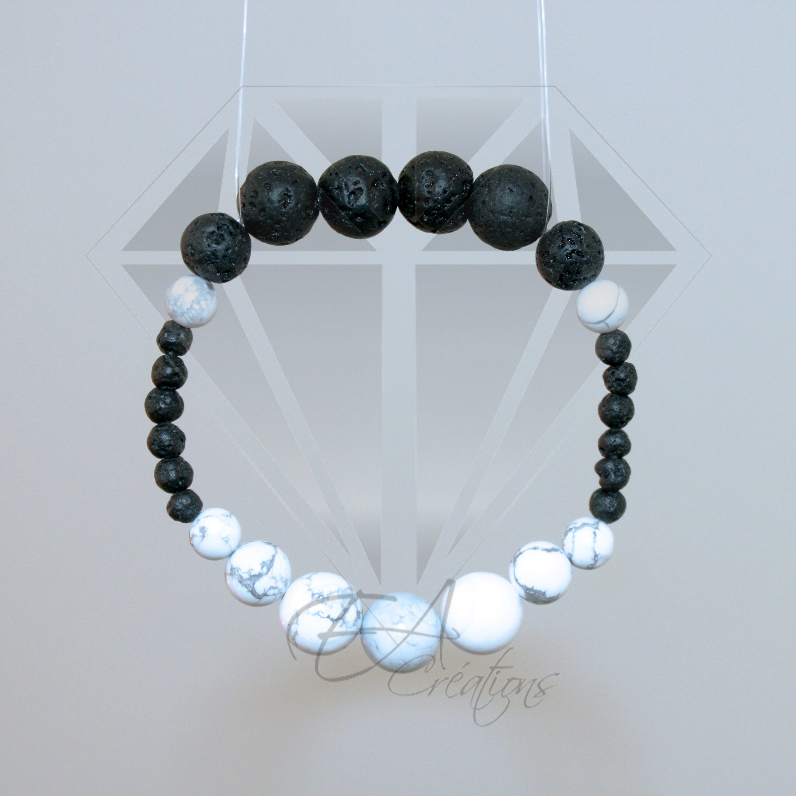 Ce bracelet est composé de 27 pierres de lave et howlite de 4 mm à 10 mm.