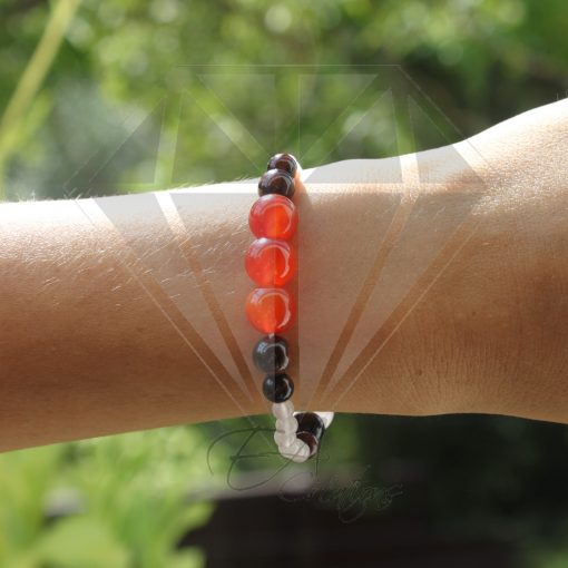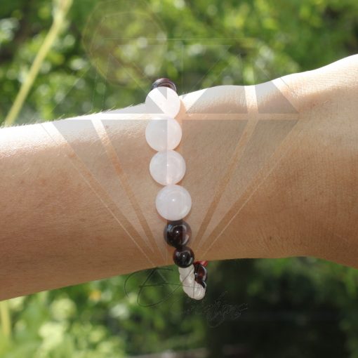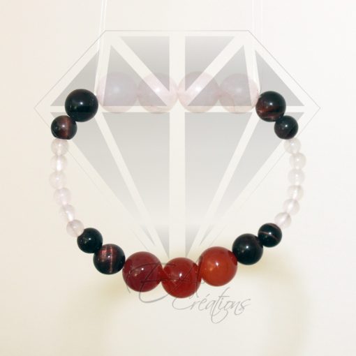 Ce bracelet est composé de cornaline, d’œil de taureau et de quartz rose de 4 mm à 6 mm.