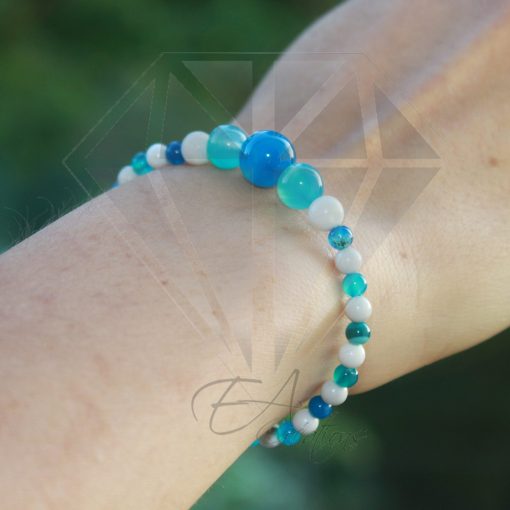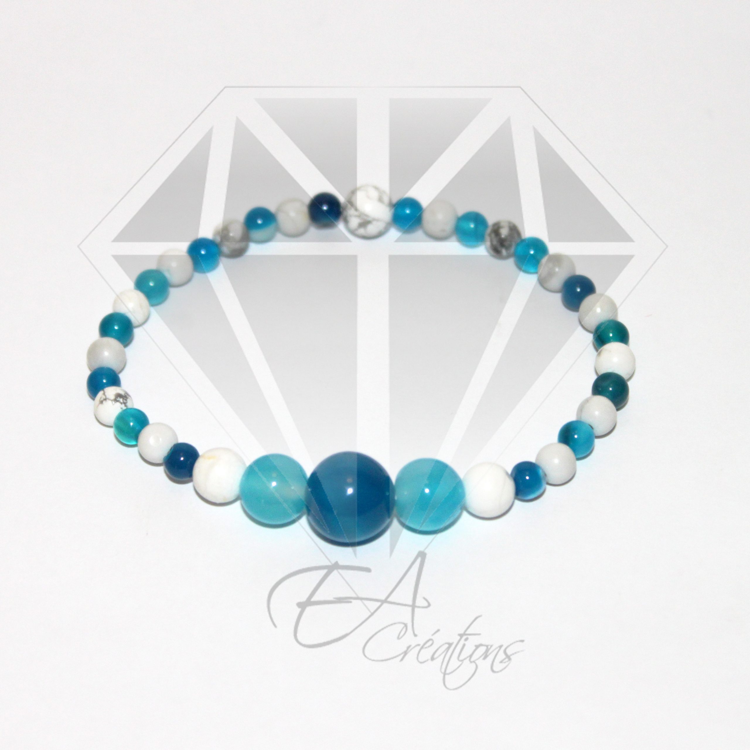 Ce bracelet est composé d’Agate bleue et d’Howlite de 4 mm à 10 mm.