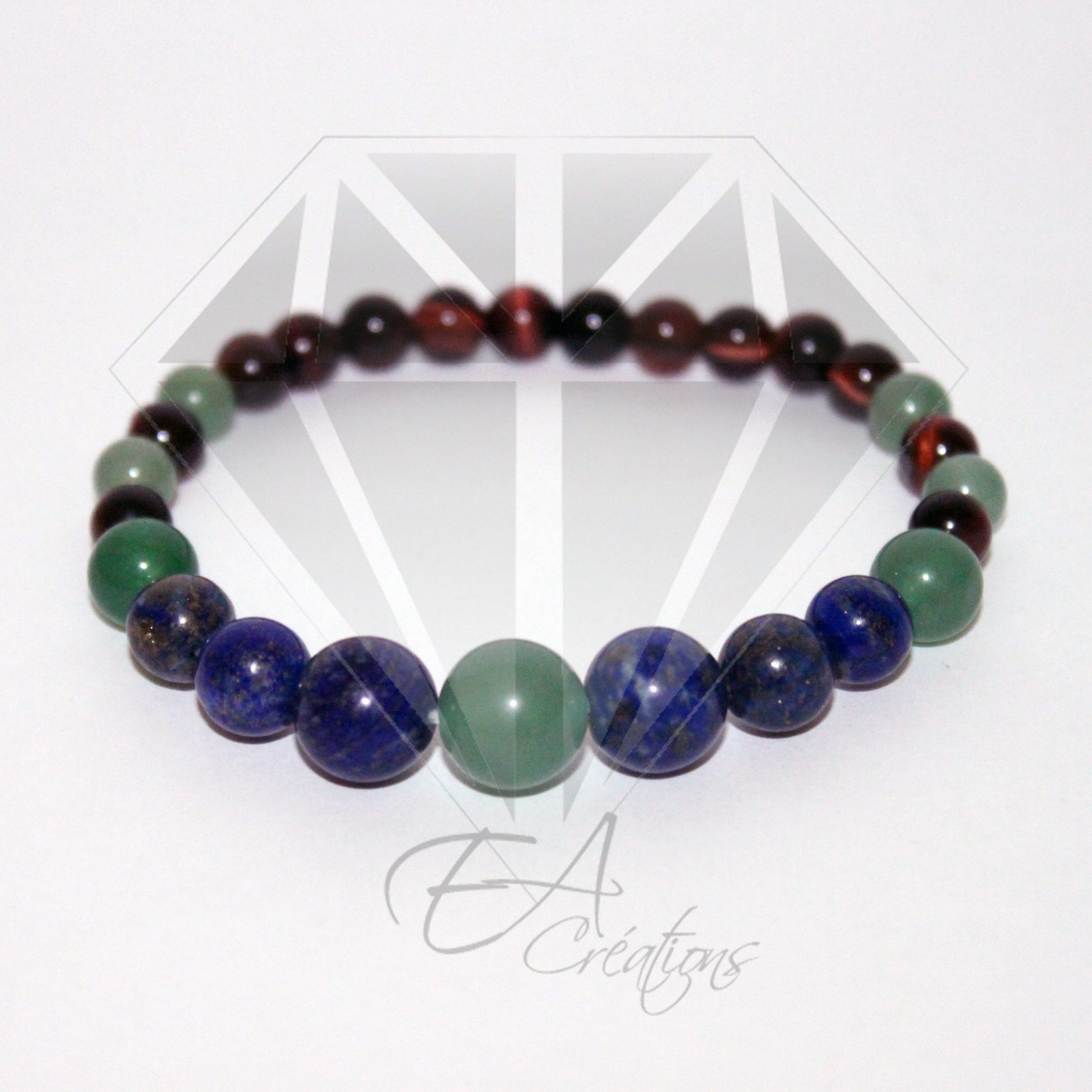 Ce bracelet est composé de Jade, Lapis lazuli et Œil de bœuf de 6 mm à 10 mm.