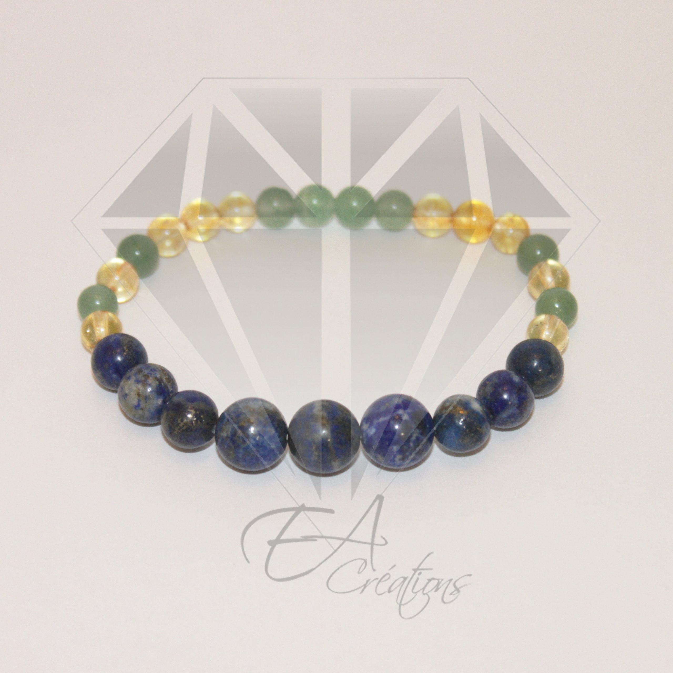 Ce bracelet est composé de 27 pierres de Citrine, Jade et Lapis lazuli de 6 mm à 10 mm.
