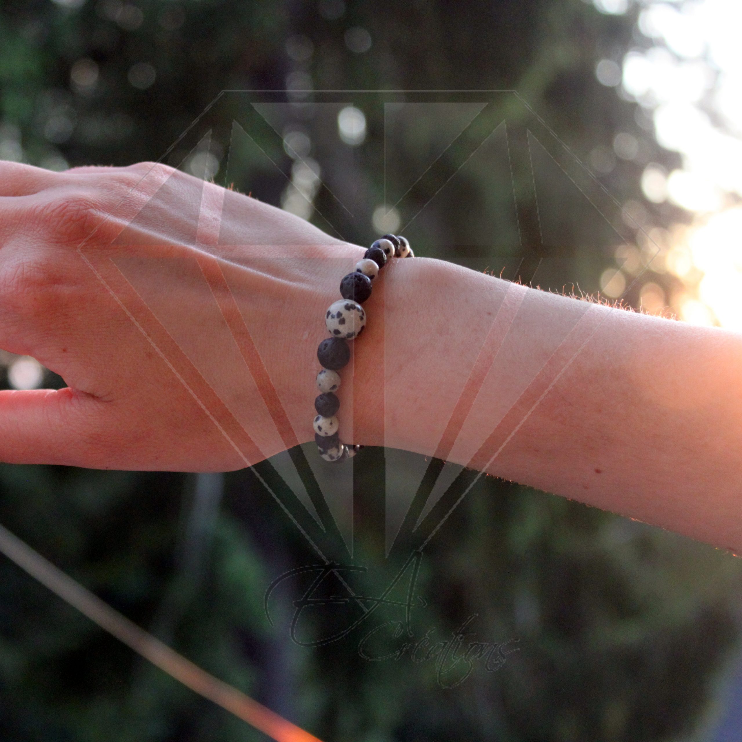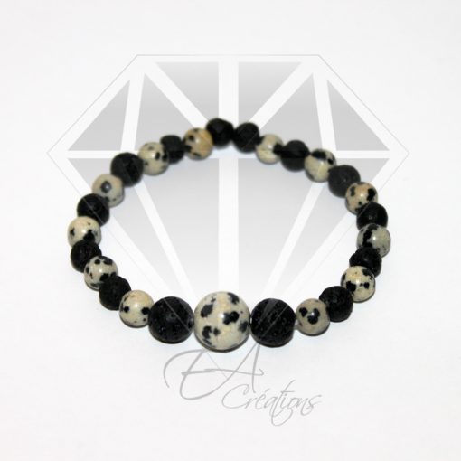 Ce bracelet est composé de jaspe dalmatien et de pierre de lave de 6 mm à 10 mm.