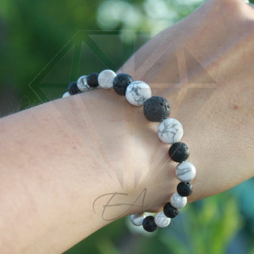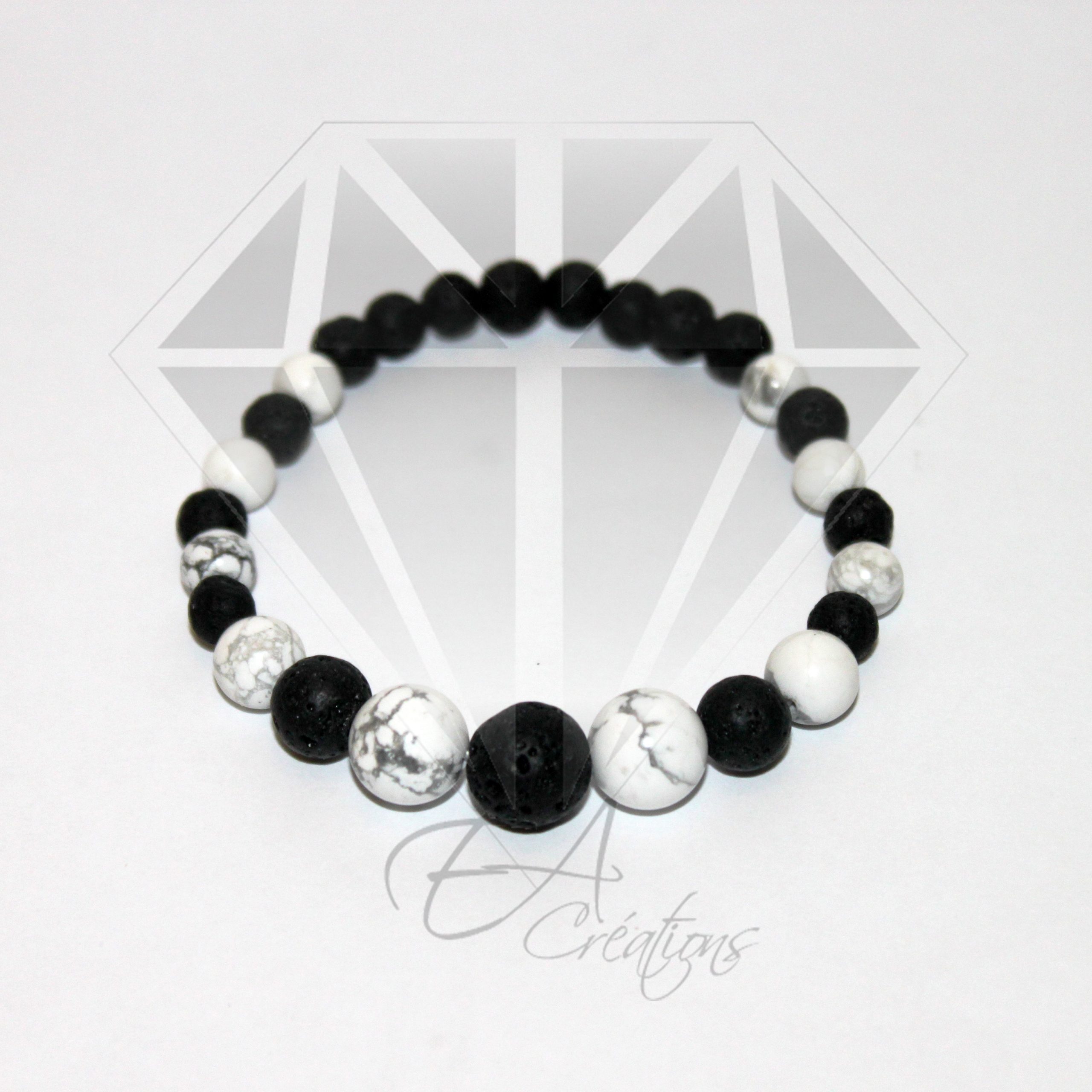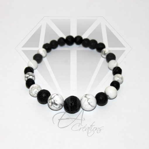 Ce bracelet est composé de Howlite et de pierre de Lave de 6 mm à 10 mm.