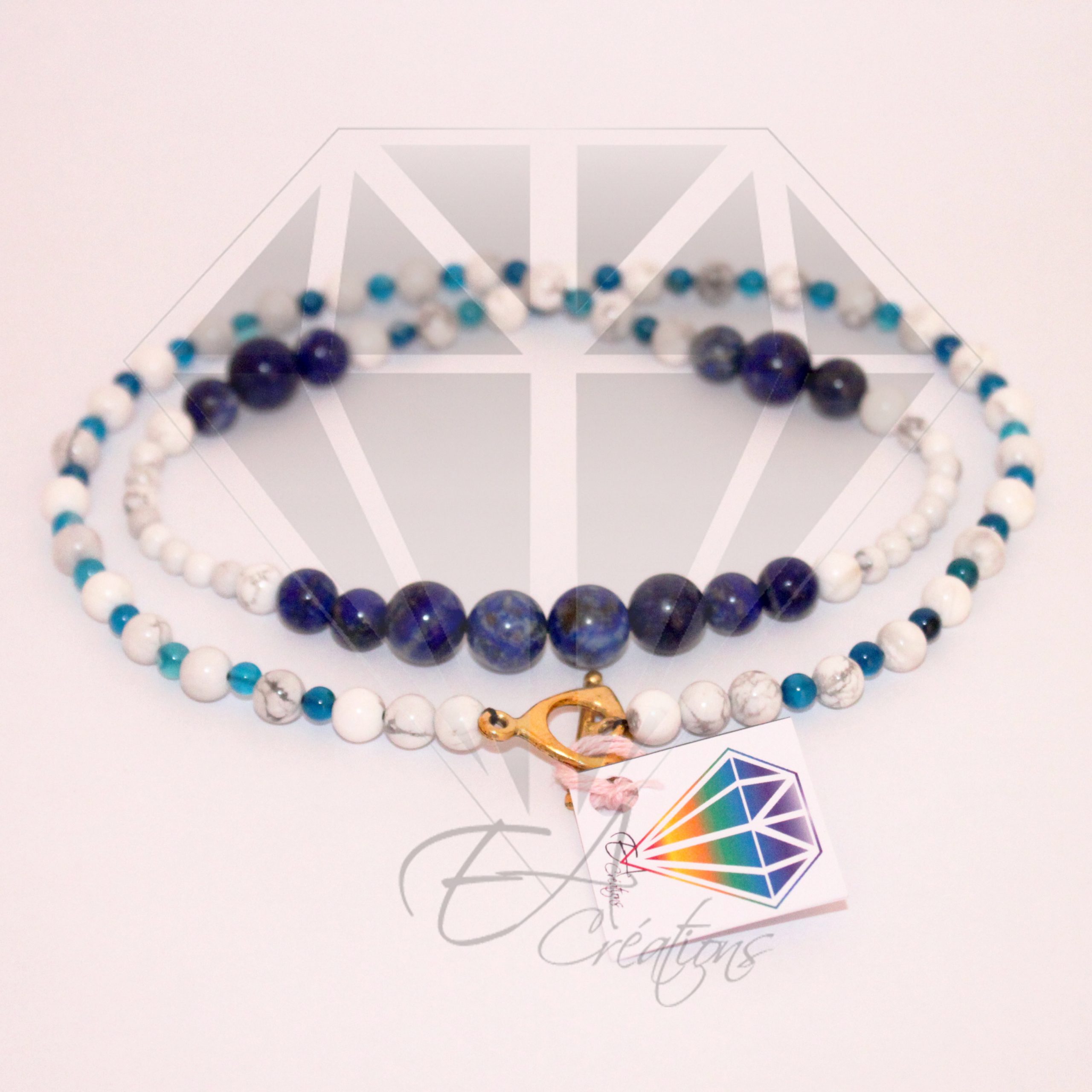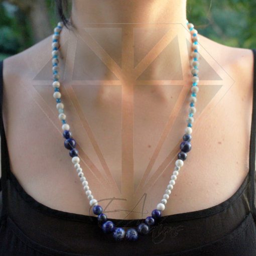 Ce collier est composé d’Agate Bleue, Howlite et Lapis lazuli de 4 mm à 10 mm.