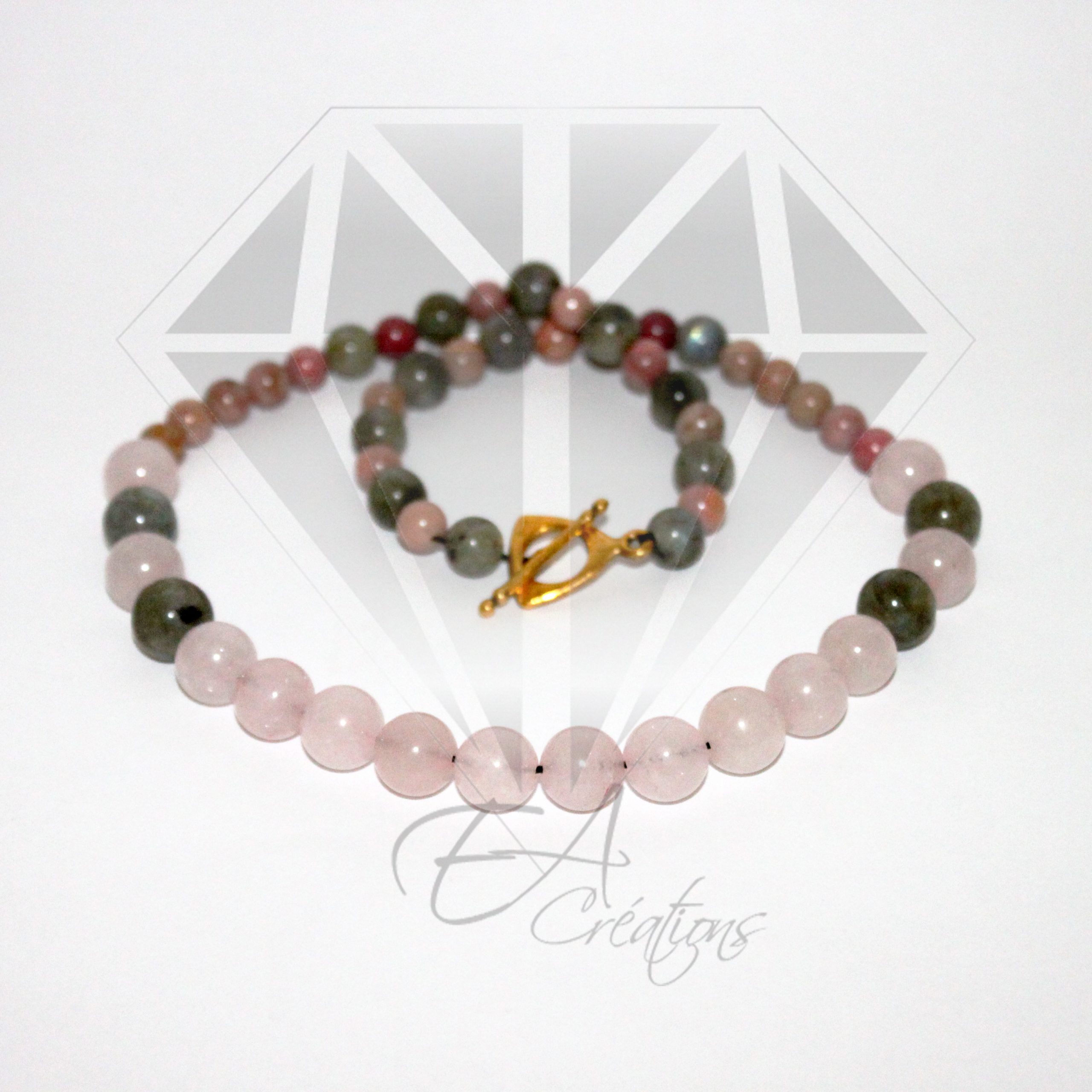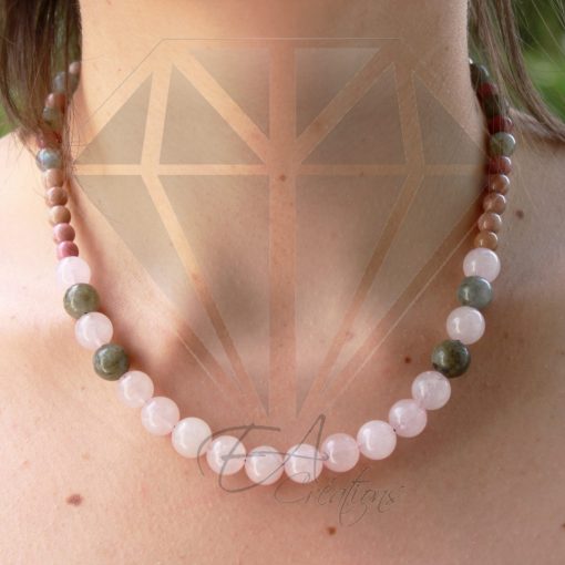 Ce collier est composé de labradorite, de quartz rose et de rhodochrosite de 6 à 10 mm.