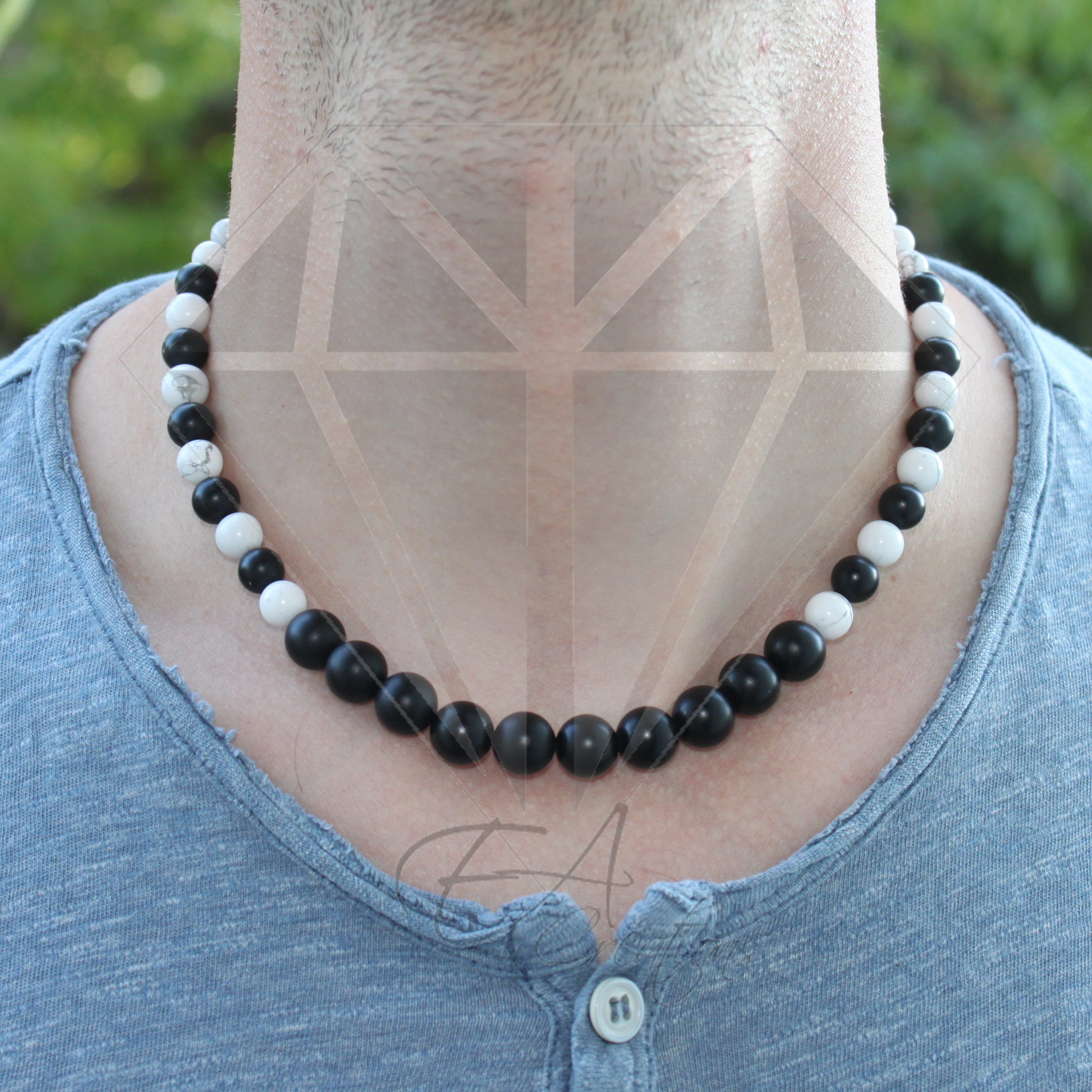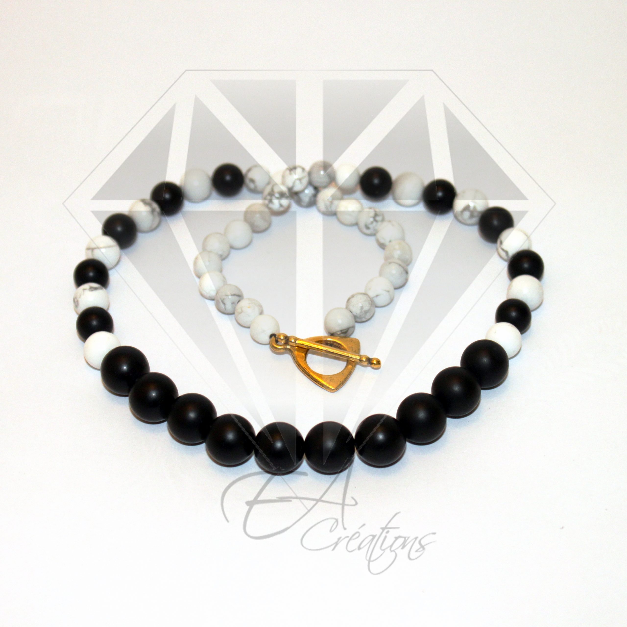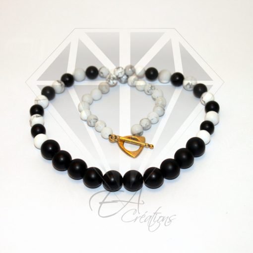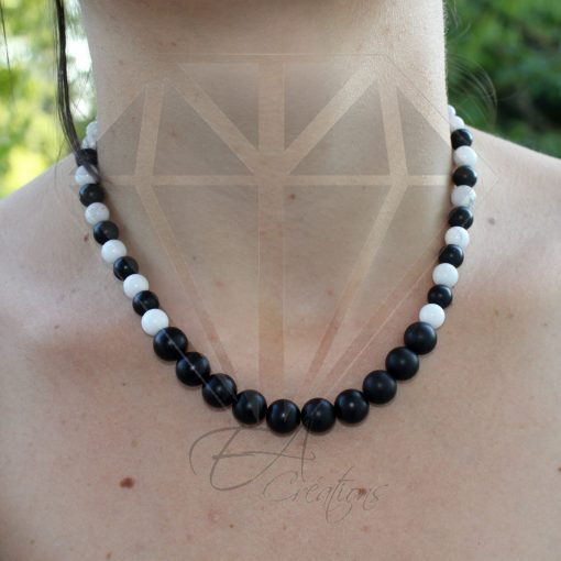 Ce collier est composé de howlite et d’onyx de 6 à 10 mm.