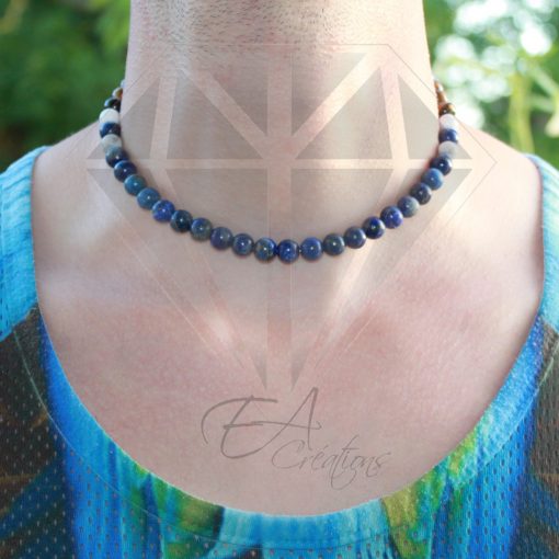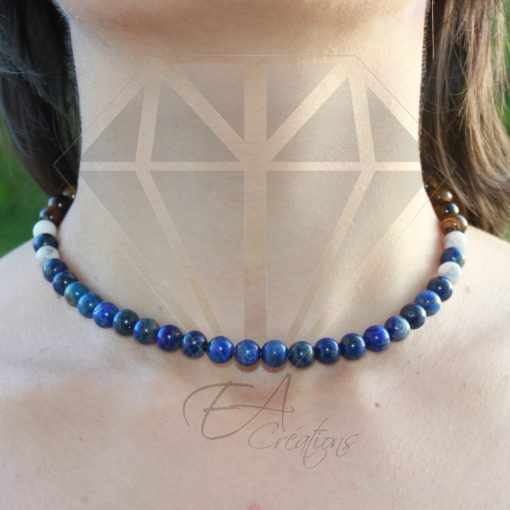Ce double bracelet / collier est composé de 54 pierres de Howlite, Lapis lazuli et Œil de Tigre de 6 mm et 8 mm.